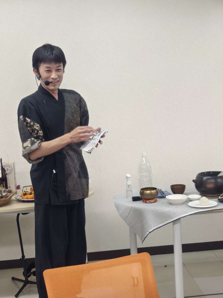 スタートして和氣あい愛としてきたところで三井 勇(おむすび伝道師)さんの自然米おむすびワークショップ。「おむすびで自分と繋がり、内側から溢れる笑顔を紡いでいく」という三井さん。ご自身の過去の体験談からおむすびを通しての活動のお話を聞き、瞑想をして三井さんご自身も田植えから稲刈りまで参加した白井市神々廻の自然米を使用し,土鍋で炊きあがった熱々のお米を皆でおむすびにしました。そんな三井さんは様々な場所でおむすびを結ぶように、心もふんわりと結び合う場づくりを行っています。