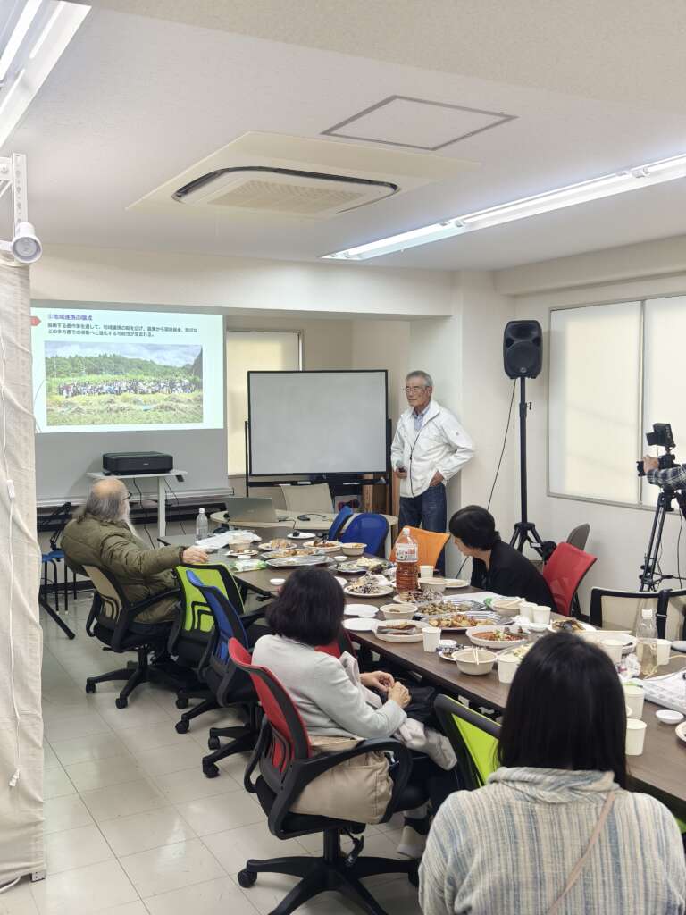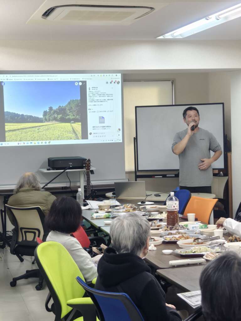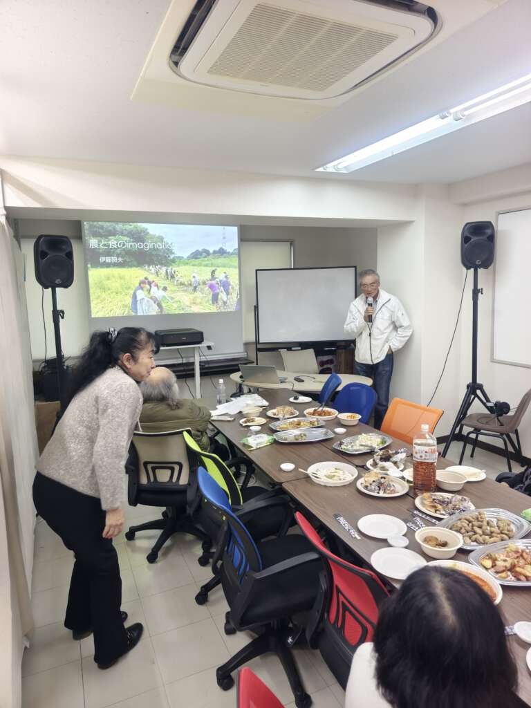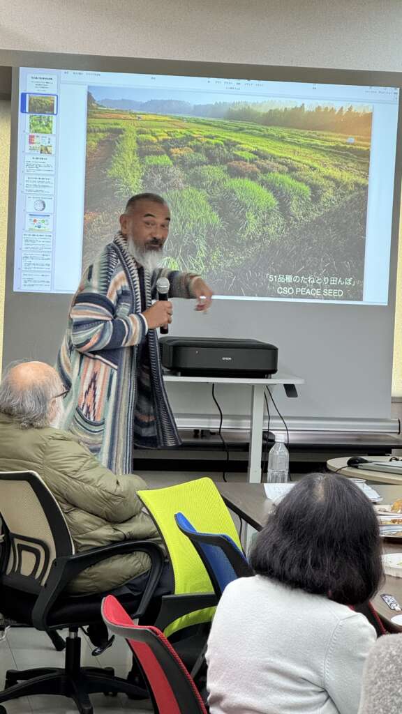 今回の主要テーマである ご自身のたねとり田んぼの芸術活動お話から「食と農の 草の根 安全保障」 についてのお話がありわかりやすく説明いただき、参加者の皆さんと真剣かつ率直な意見交換が行われました。