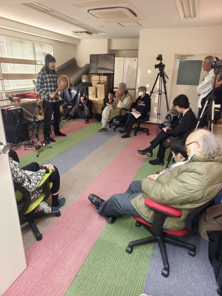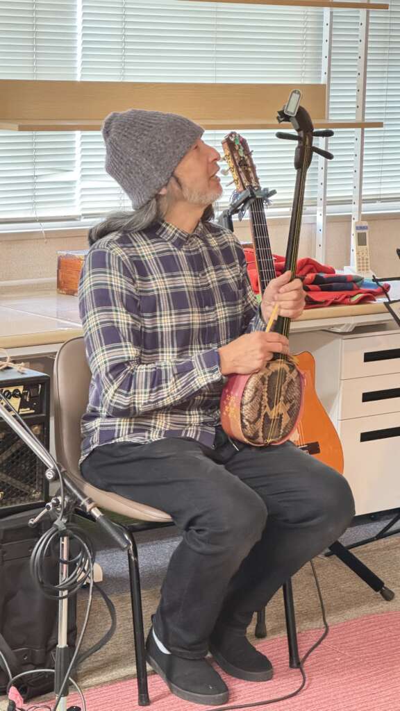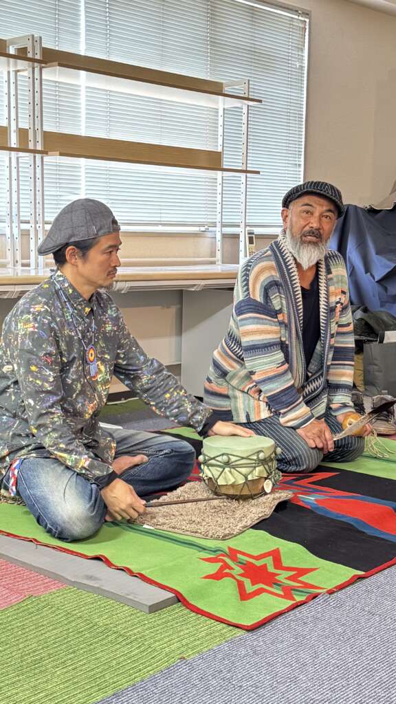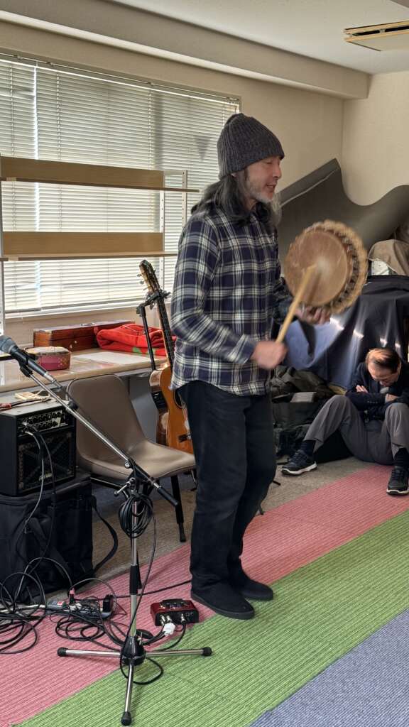 いよいよ会場はマットフロアに移動します。いつも映像を会場で撮影してくれていますおなじみ結さんはというと、、、奄美島唄独特のこぶしや裏声で聞く者の心に訴えかける唄声を持ち、奄美大島南部の島唄伝承の第一人者と言われる朝崎 郁恵さんのお弟子さんでもあります。今回も奄美地方の現状や奄美唄でつかわれる三味線や太鼓の説明や語り継がれる唄を披露してくださいました。