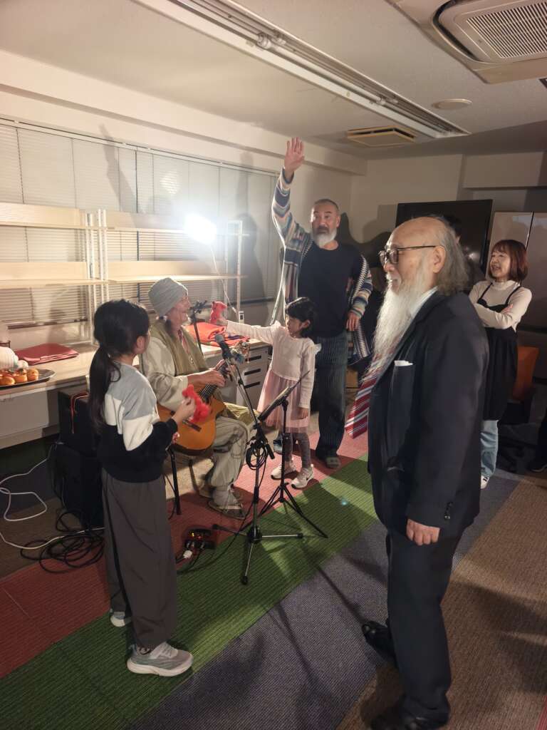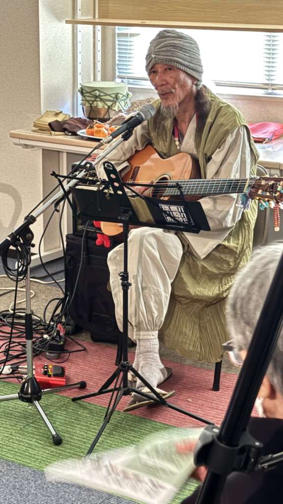 様々な農と食にまつわるエピソードとともに曲を披露してくださいました。 ご子息を愛妻様の股から取り出したその瞬間に生まれた曲「日和歌」、かわいい胡麻の種の神秘から出来た曲「ゴマの花」、NHKみんなのうたでもあった「パッパラパパ」、 天波さんが住んでいる葦北を襲った線状降伏帯の猛雨がもたらして、引っ越す直前に住んでいた家が流されていく様を見ながら命からがら避難していた時に生まれた「葦北Heavy Rain」などたくさんの曲と、めったに聞けない天から地から湧き上がってきたような「お話=歌」で会場は笑いと熱気に包まれ最後は皆で丸米カノンを踊り歌って会は大盛況で終了いたしました!