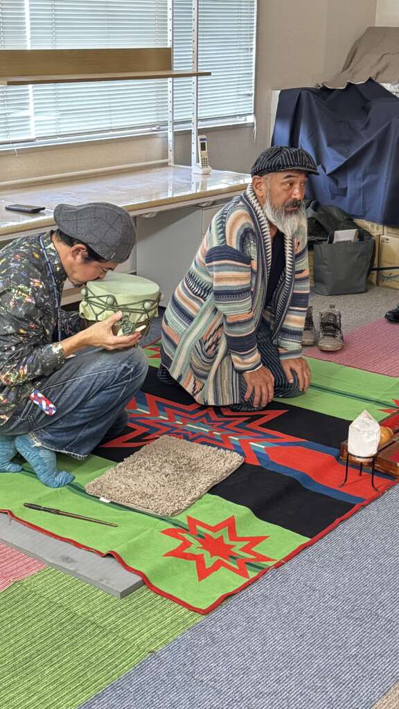 荒井紀人&伊藤淳 prayer song(ペヨーテソング) で収穫を祝す演奏。その後どぶろくと自然酒で乾杯、食の恵みに感謝する温かな収穫祭がスタート。笑顔と会話が絶えない、まさに秋の実りを分かち合う時間。