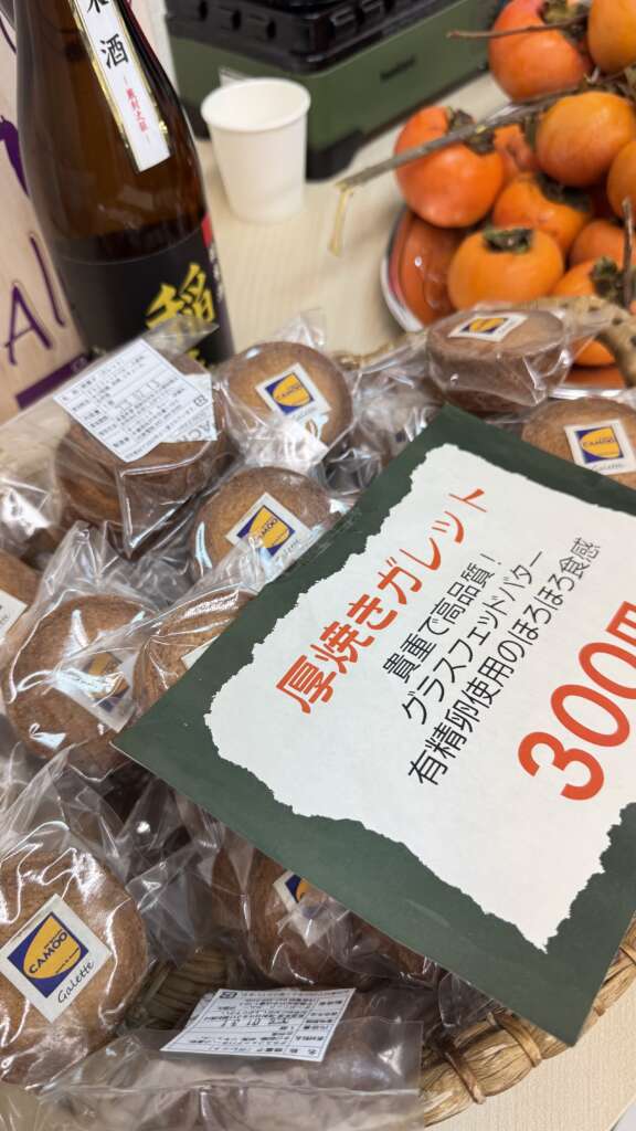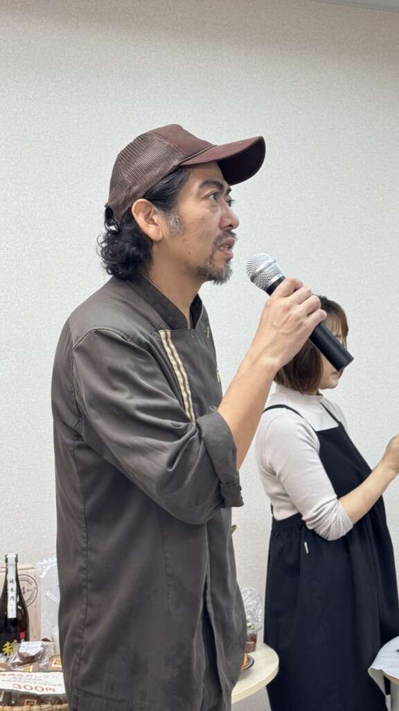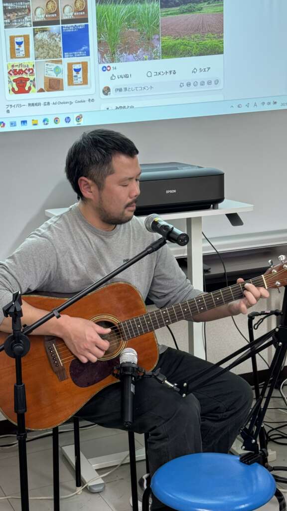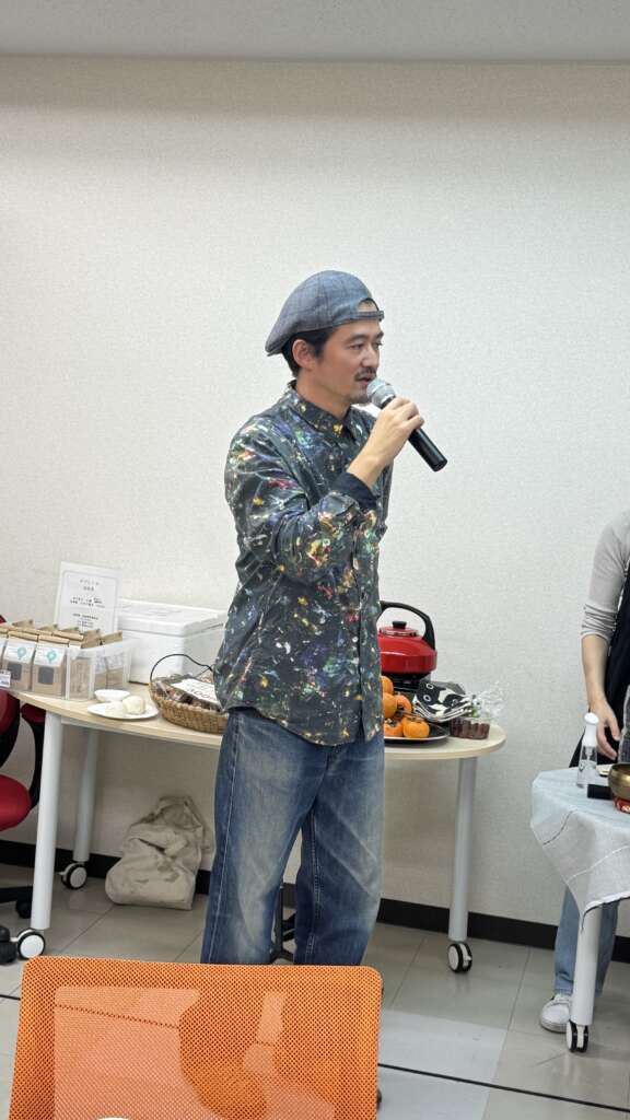 生き物が豊かに暮らす里山で無農薬栽培を実践する「みやもと山」の齋藤超さんから、リアルな現場のお話を伺いました。ご自身とご両親のアトピー体験から始まり、ご先祖・ご家族の農法の遍歴(農薬使用から無農薬への転換)、宮本地域の里山特性による田んぼの地盤や生育植物の違いがお米栽培にもたらす良さと難しさ、そして道具の工夫について、詳しくお話しいただきました。また、周辺農家さんの高齢化という現実に対し、アジア系移民との共生という前向きな解決策等の齋藤さんの視点は、まさに現場から生まれる貴重な知見でした。ご両親の時代の農薬と現代の農薬の違いや安全性の比較を通して、参加者にもわかりやすく「農の現状」を説明してくださいました。ミュージシャンでもある齋藤さん、心いやされるギターの演奏もしていただきました!今後の出店もお楽しみに!